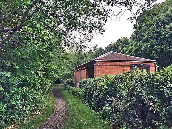 Barnards station seen from Station Road crossroads in June 2022. Baynards Road is to the left, Station Road to the right. Lawns Road is ahead, the gate in the distance is the entrance to the goods yard.