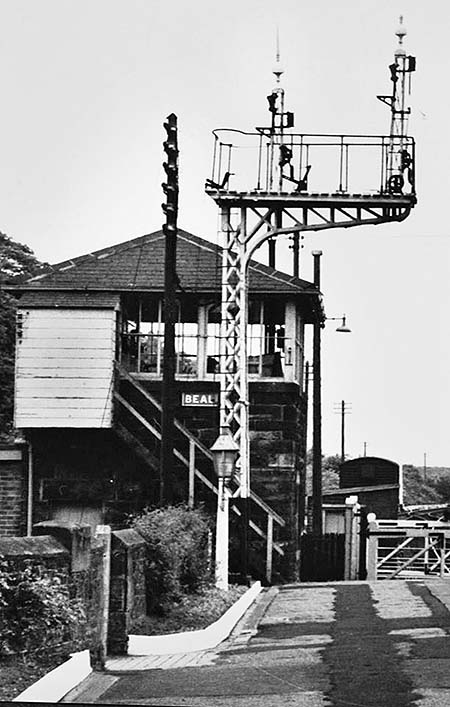 ![]() Beal station signal box at the north-western end of the down platform. The semaphores appear to have been removed from the gantry. An oil lantern is seen on the platform and an electric lamp on the telegraph pole. The signal box would close in 1982. The date of this photo is not known.. Photo from Garreth Lauder Patterson collection from Railways of Berwick and the Eastern Borders private Facebook group