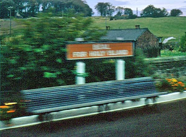 The LNER running-in nameboard on the up platform, repainted in BR(NE) colours, is seen from a moving train in October 1967.
