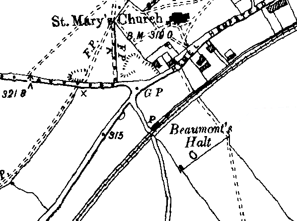 The halt derived its name from the nearby Beaumont Hall. It was located on the south side of a level crossing for an access road to Flowers Farm. The gatekeeper's cottage on the north side of the crossing predated the halt. Unusually Ordnance Survey incorrectly show the halt on the north side of the crossing.