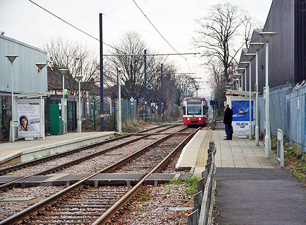 A Wimbledon tram has just crossed Beddington Lane and is arriving at at Beddington Lane tram stop in May 2005.