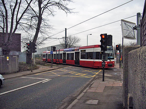 A tram bound for New Addington crosses Beddington Lane level crossing in May 2005.