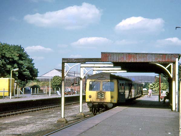 A Cravens DMU waits for passengers before leaving for Bletchley in July 1974. The driver is sitting under the shade of the canopy.
