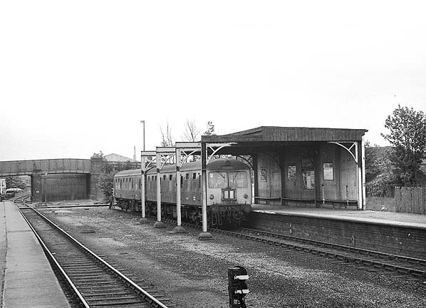 A Bletchley DMU waits at Bedford St Johns station in 1974. Beyond the station the bridge has been partially blocked, temporarily leaving a single track which continues to Goldington power station. This remained in use until 1979.