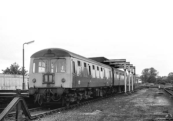 Bletchley DMU waits in the former up platform Bedford St Johns station in 1974.