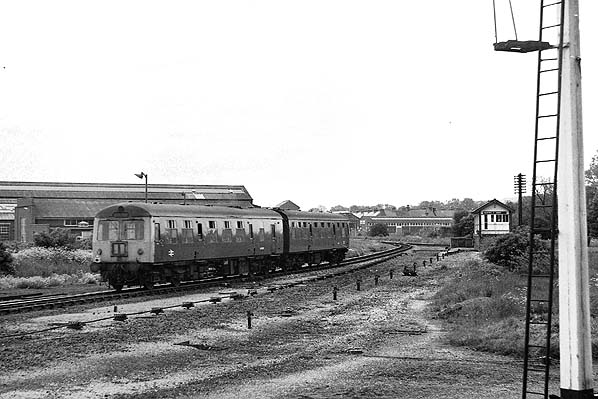 ![]() ![]() ![]() A Bletchley DMU has just left Bedford St Johns station and is passing along the southern side of the triangular junction in 1974. The former Midland Railway Bedford to Hitchin line crossed on the level between the front of the train and the signal box. Photo by Ian Smith ![]()