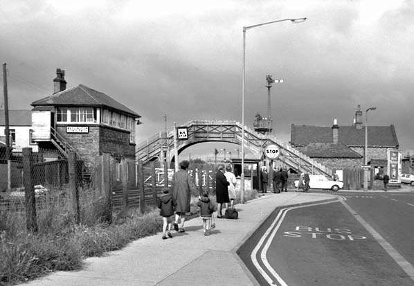 Looking north-west towards Bedlington South signal box, the level crossing and footbridge, and the station building in September 1971.