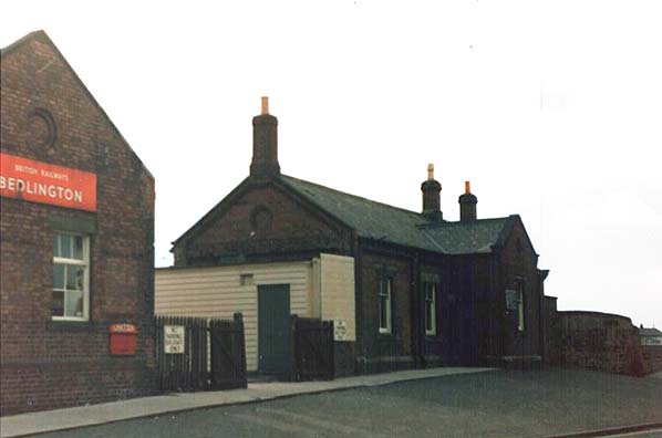 ![]() This exterior view from 1976 shows that the northern (right hand) building was similar to those at the minor stations of Seghill and Bebside. Although passenger services have been withdrawn for over a decade the station still proudly proclaims its name in BR(NE) livery.