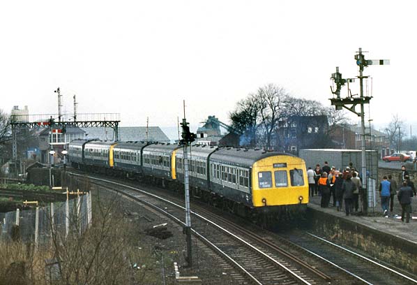 ![]() The ‘Chevy Chase’ railtour formed of a 6-car DMU calls at Bedlington on the afternoon of 26 April 1986. This tour made a couple of visits to the station as it toured the Blyth & Tyne, taking the Cambois (North Blyth) branch on its travels. The station buildings are to the right, off the picture, and Bedlington North signal box is ahead.