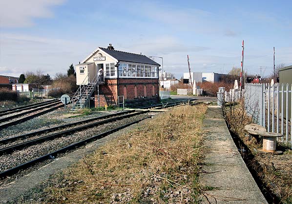 ![]() Bedlington North signal seen from the north end of the station platform in March 2009. The bay platform is seen on the right.