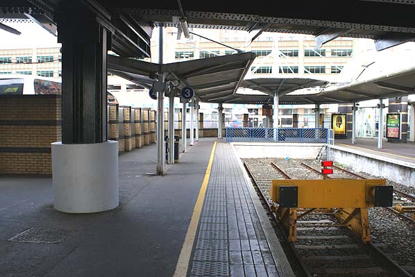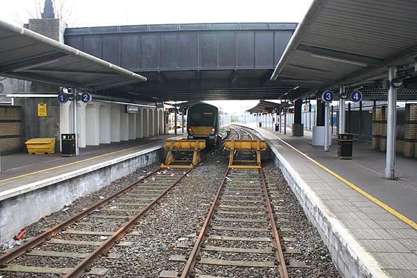 Looking west on 19 april 2014 from what would have been inside the train shed at Belfast Great Victoria Street. The 1995 station seen in the view extends beyond the site of the original.