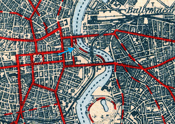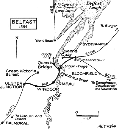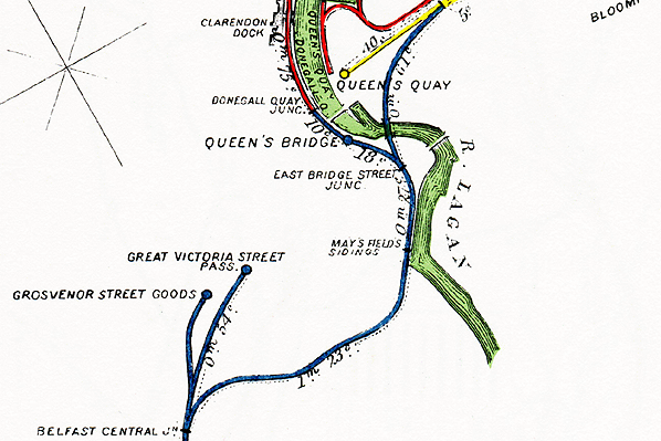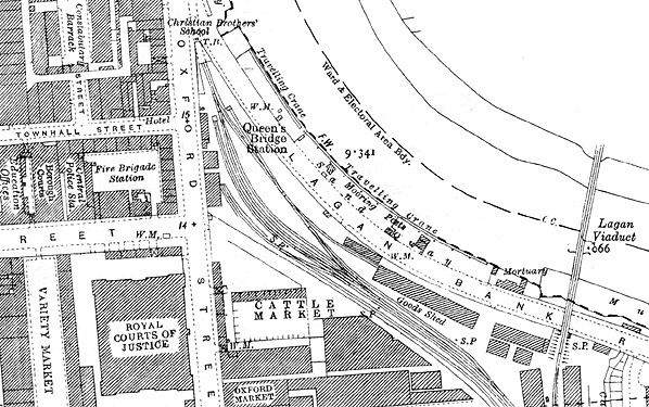 Notes: Belfast Queens Bridge was the northern terminus of the Belfast Central Railway (BCR). The BCR had originally been authorised in 1864 but land in central Belfast was expensive and the project stalled owing to financial difficulties. It took a new Act and a new Board of Directors in 1872 to push the work forward. The line branched off from the Great Northern Railway [Ireland] (GNR[I]) at Ulster Junction (which later became Belfast Central Junction), which was half a mile to the south of that company’s Belfast terminus Great Victoria Street, and it ran for 1 mile 41 chains to the Queens Bridge which spanned the River Lagan. Just to the south of Queens Bridge (at East Bridge Street Junction) a 61 chain branch crossed the River Lagan and made a connection with the Belfast & County Down Railway (B&CDR) at Ballymacarrett Junction. The purpose of the BCR was to make a connection between the two companies and also to a third, the Belfast & Northern Counties Railway (B&NCR). The link to the B&NCR was not built due to cost, but later a tunnel was built under Queens Bridge which provided a link to the dock board railway which in turn connected with the B&NCR. The link via the dock board line was not really suitable for passenger traffic.