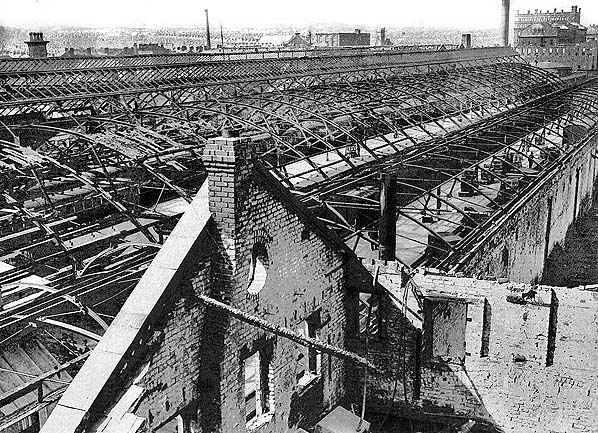 During 7 and 8 April 1941 Belfast experienced very heavy bombing and York Road station was badly damaged. The Midland hotel was completely destroyed. The station is seen in this view shortly after the bombing raids.