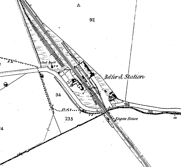 Belford’s coal depot was situated to the north-west of the passenger station, served by two sidings training from the down line. The goods facilities were behind the up platform, with the large two-road goods warehouse originally having one siding passing through, and a loop between it and the platform. A short siding was found between the down platform and the level crossing. By the end of the century two further sidings had been installed west of the coal depot and a second siding entered the goods warehouse from the south-east.