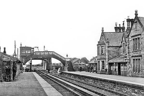 The North Eastern Railway installed a standard curved-profile footbridge south-east of the platform buildings. This graceful design was made up of cast iron parts which were erected on site. The castings were lettered and numbered to facilitate assembly. Regrettably the original standard drawing for these bridges is undated, but they appeared at many NER stations in the late nineteenth century. A timber lock-up shed was also added in NER days between the station building and the south-eastern end of the platform.