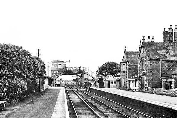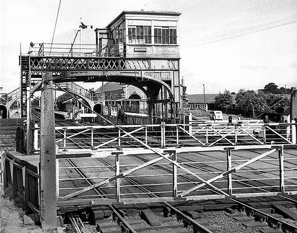 A signal box was built by the NER between 1873 and October 1877 north-west of the level crossing on the down side. This was abolished c1901 when an N3-style bridge cabin replaced it above the up main line track and located immediately north-west of the crossing; a 52-lever Stevens frame was installed.