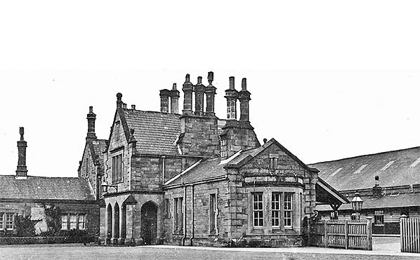 The up platform had the standard style of N&B waiting shed, stone-built with a pent roof sloping down towards the platform edge. In common with other N&B stations at Belford the waiting shed was enclosed with timber and glass by the North Eastern Railway and provided with a fireplace to provide passengers with greater comfort. Behind the up platform was the commodious two-road goods warehouse. This elegant structure complemented the station house, being built of sandstone beneath a ridged Welsh slate roof, with its gables flanked by kneelers and surmounted by ball finials.