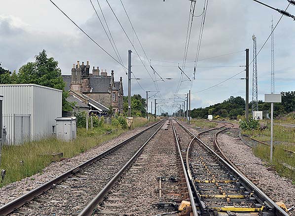 Looking north-west across the extensive site of the former goods yard towards the disused Belford station’s building in July 2015. When (or if) the passenger train service is restored at Belford the new platform is likely to be on the loop line just right of centre of the photograph.
