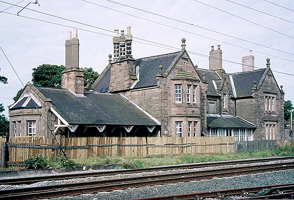 ![]() Belford station building in August 2001, looking north-west from the level crossing. The building is little changed in over 30 years since it closed. At the time of this photograph it is in use as holiday accommodation. Unfortunately holidaymakers do not have the convenience of a train service that they can use.