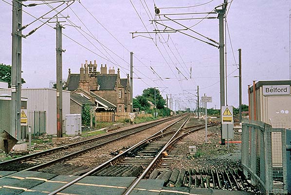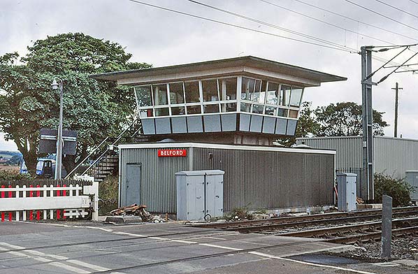 ![]() Station Name: BELFORD, for BAMBURGH![]() Belford signal box looking north-west from the level crossing in August 1989. The infrastructure for the electrification of the main line, which would be completed in 1991, is in place. The signal box would be closed on 8 July 1990. The tangerine BR(NE) nameplate is still in place 24 years after the Corporate Identity ‘black-and-white’ era began.