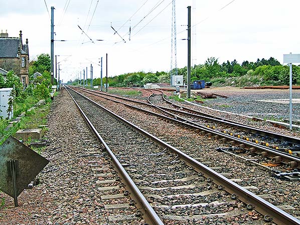Photo by Roy Lambeth ![]() The former passenger station (left) and goods yard (right) at Belford are seen in May 2009, looking north-west from the level crossing. If Belford station is reopened to passenger traffic the platform would be sited opposite the old station building on the up loop line, seen on the right