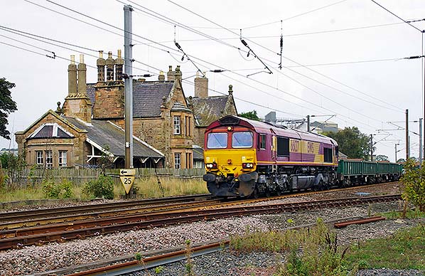 ![]() In June 2014 an EWS Class 66 hauls a southbound freight train past the former station