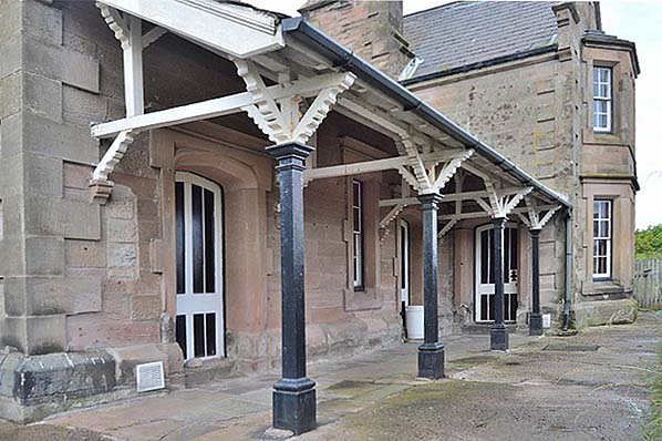 it adjoins the remains of the coal drops. The former station building at Belford is Grade II listed and retains many of its original Newcastle & Berwick Railway features. As seen on this photograph in July 2015 the south-eastern verandah is well preserved, and this angle allows the details of its construction to be studied. The restrained Gothic arches above the doorways are a charming feature. Beyond the double (two-storey) canted bay a further verandah survives and is seen on other track-side views of the building. A small section of the old down platform is still in place in the foreground.