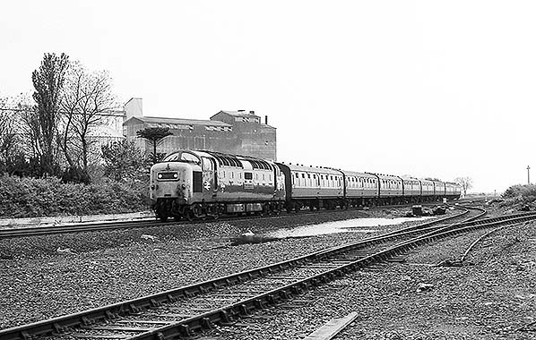 An up passenger train headed by a Class 55 ‘Deltic’ is approaching the site of Belford station in 1976 and passing the silo on the far side of the tracks.