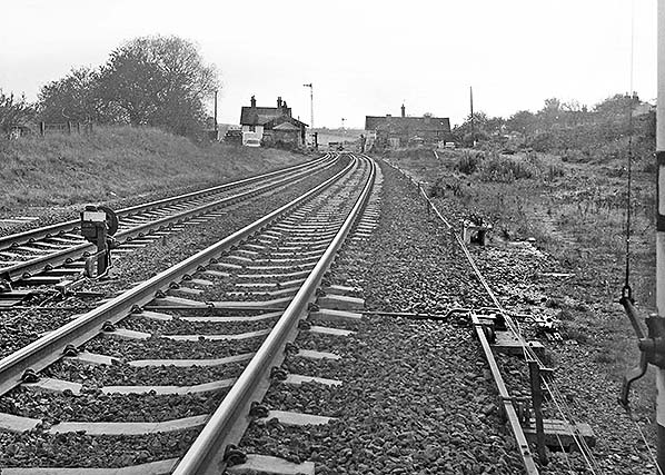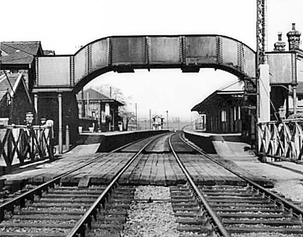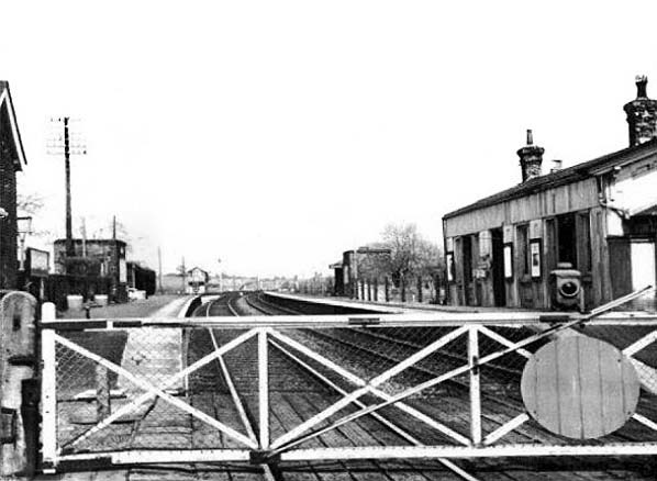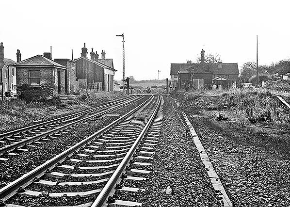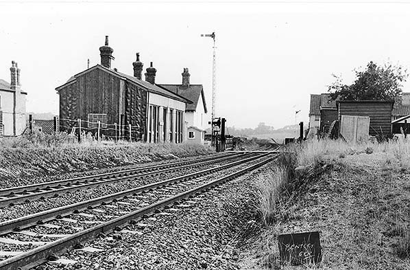 Photo by Ben Brooksbank ![]() Looking north from the Station Road level crossing circa mid 1960s, probably before closure to passengers; the station now looks very run down. The goods yard closed in 1964. The goods shed was quickly demolished and the platform canopy removed. Notice boards still remain on the station building. The waiting room on the up side has also gone although the gents' toilet with its flat roof remains. Another gents' toilet, complete with sign, is seen on the opposite platform. The footbridge has also been demolished.