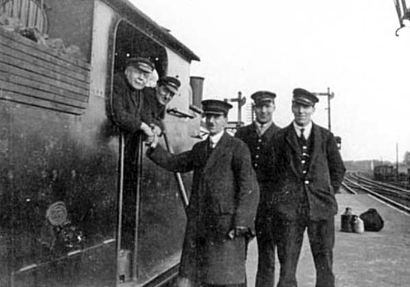 1932 - c1972 ![]() The bay platform at Bentley sees, presumably, the stationmaster shaking hands with the driver of one the ex-GER 2-4-2T locomotives as the fireman and other members of staff look on. The date is Saturday 27 February 1932 and the occasion the final regular passenger train on the Hadleigh branch. On departing the bay platform, the train will run alongside the Down Main line for a little over half a mile before turning away towards Hadleigh. Having completed the final journey, the train likely arrived back at Bentley's Up platform before continuing to Ipswich as empty stock. Although well into LNER days, the locomotive still carries its GER numberplate. The number is unclear but certainly begins with a '5' and perhaps followed by an '8', telling us the locomotive is a Class F4 (GER Class M15). The various classes of GER 2-4-2T had begun life on suburban services out of Liverpool Street. Although some remained in the London area, or returned there later, many were displaced to East Anglian sheds for use on branch lines, while during WWII a few worked with armoured trains and could be seen from Kent to Scotland. The final F4 bowed out in 1956 while the final rebuilt version, F5, lasted until 1958.