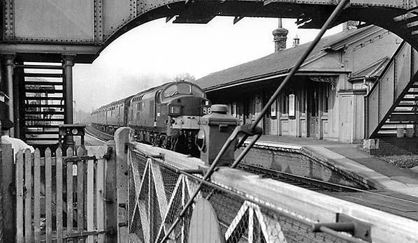 Photo by David Pearson ![]() In June 1963 an English Electric Type 33, later Class 37, thunders down the 1 in 157 Belstead Bank through Bentley with a train for Liverpool Street. At this date, expresses on this route were mostly in the hands of these locomotives and a handful of the original batch of English Electric Type 4s which went on to become Class 40. Within a few years the line would come to be dominated by the Brush Type 4, later Class 47. The headcode on the Type 3, 1 - 58, was from the system peculiar to the Great Eastern section and which simply indicated class of train and destination or origin. In this case the '58' informs us the train had commenced its journey at Ipswich. In April 1966 this headcode system was abandoned in favour of the four-character system which is still in use today, albeit no longer displayed on trains. On the left the crossing keeper can be seen and, partly obscured, the lever frame and instruments for the level crossing. The frame was unlocked from the signal box (at the opposite end of the station) but interlocking was not provided until 1899.