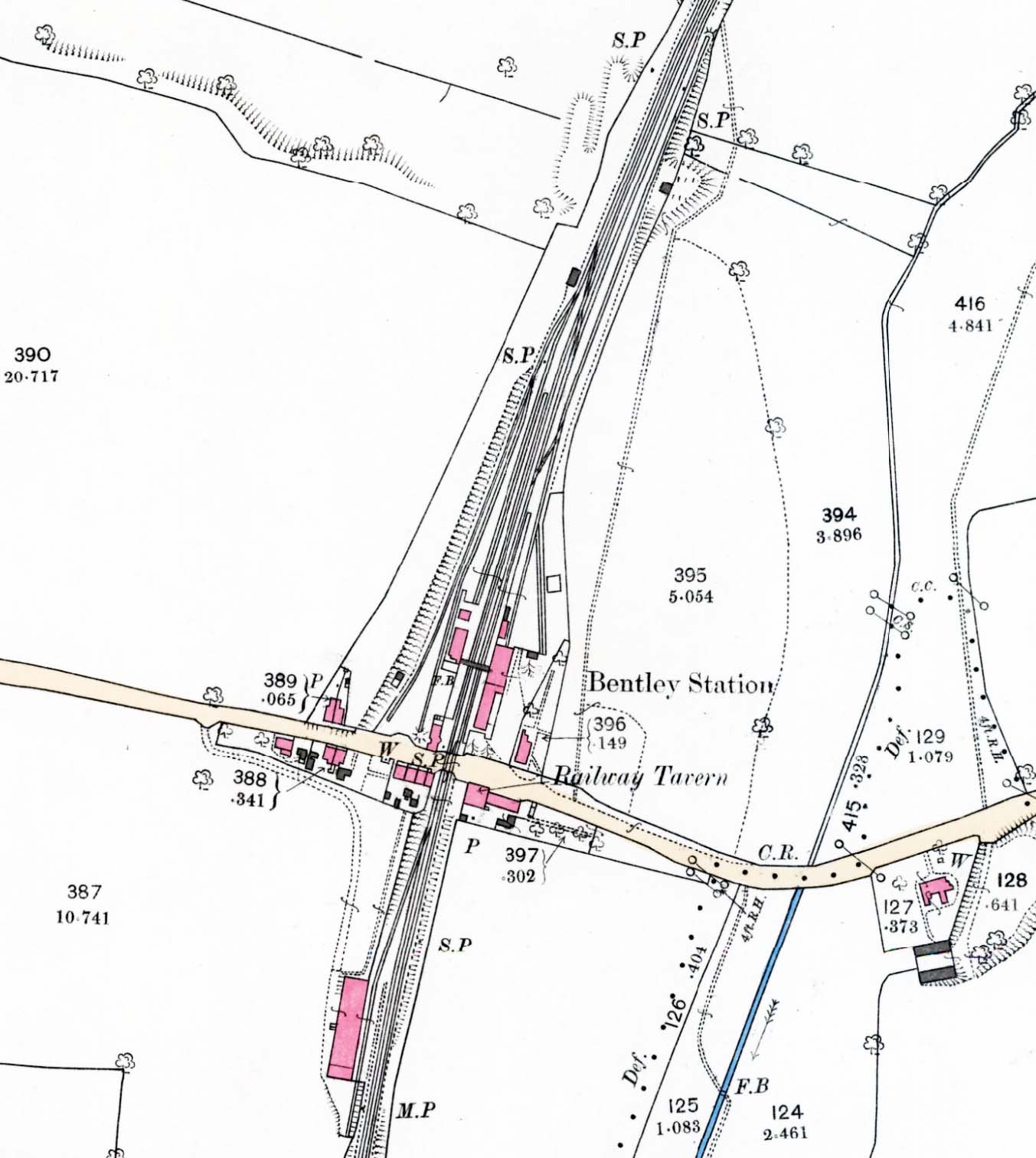 1892 1:2,500 OS map. This map clearly shows the complex layout of Bentley station with sidings on both sides of the line. The station was located on the north side of the Station Road level crossing with the Down platform and Bentley branch bay platform on the west side of the line and the Up platform on the east side. The main station building is on the Up side, the large building also incorporates a goods shed at its north end. A smaller waiting room and gents' toilet stands opposite on the Down platform. A footbridge spans the line between the two buildings. Two diverging cartage sidings are provided on the down side running on the west side of the bay road. On the Up side terminates at the north end of the goods shed while another siding runs diagonally south-east from this siding running past a small cattle pen. Two signal posts are shown on the down side and the signal box is shown but not identified at the north end of the cartage sidings alongside the bay road. The branch line continues north alongside the main line. The Railway Tavern is identified on the south side of the level crossing on the up side. South of the station Wilson's siding is seen on the Down side serving an unidentified Malthouse.