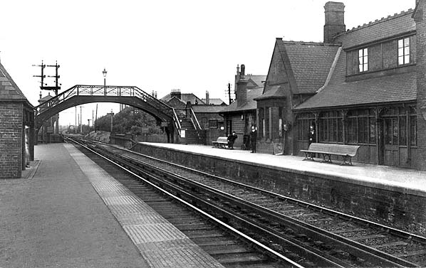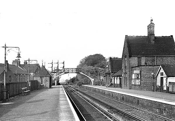 The north-east platform had a delightful brick-built waiting shed, with a hipped slate roof embellished with cresting, and with elaborate finials at both ends. Like the verandah opposite it was fronted by timber and glass. A standard NER iron footbridge, at the north-east end of the station, connected the platforms. A short distance north-east of the down platform, and beyond the Station Road bridge, was a tall signal box built with double overhangs because of the constricted site.