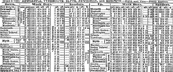 In summer 1896 Benton had a service of about a dozen trains each way between Newcastle Central and New Bridge Street via the Coast on weekdays, and nine on Sundays. Trains ran at irregular intervals on weekdays, and surprisingly there was no clear concentration of services at morning and evening rush hours. The first departure for Newcastle direct (New |