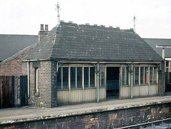 ![]() The waiting shed at Benton on the up platform in April 1973. This delightful brick structure, retained for Metro use, is enclosed by timber and glass – a common NER feature – and its two columns carry the BR(NE) ‘oriental blue’ pain, although much faded. The tall hipped roof is slated, and most of the ridge crest tiles remain in place. The intricate finials at either end of the ridge lend both charm and light-heartedness to the building.