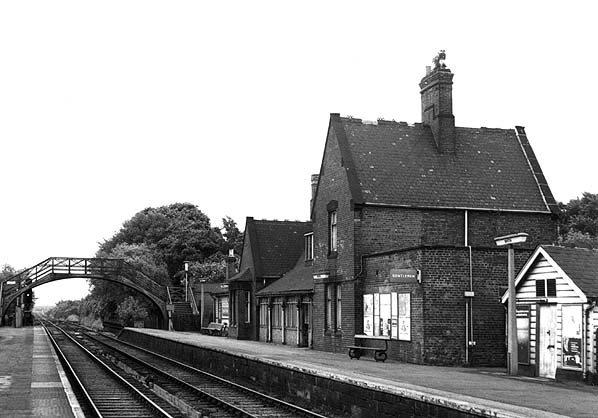 ![]() The up platform at Benton station is seen in July 1969, looking east. The station building dating from its opening in 1969 by the Blyth & Tyne is accompanied by NER timber additions at each end. By this time the electric third rails had been removed.