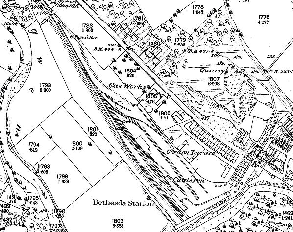 An 1889 map shows that there was a signal box at Bethesda located to the north of the station and goods facilities on the east side of the line.