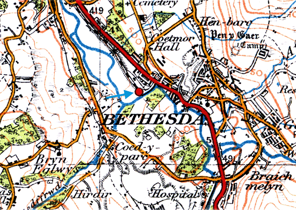 Notes: Bethesda takes its name from a nonconformist chapel in the town. Although the chapel is still exists it is no longer in use as such and has recently been converted into apartments. The town stands at the northern gateway to the magnificent Snowdonian scenery of the Ogwen valley, but it is unashamedly industrial in character and owes its development to the massive Penrhyn slate quarries immediately to the south.