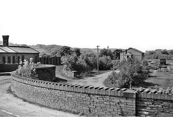 Looking in a northerly direction from the station access road in October 1963. By this time all activity at the site had probably ceased. The main station building is on the left, and the goods shed towards the right. Apart from a solitary goods wagon, the sidings are empty, and the site is
