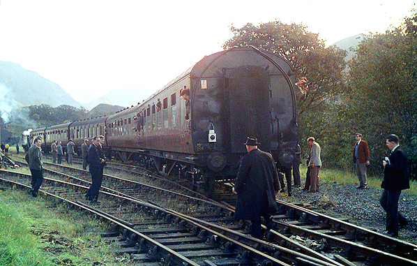 Looking south towards Bethesda station from the north end of the goods yard on 20 October 1963. The event was a visit by the Stephenson Locomotive Society (SLS) Caernarvonshire Rail Tour. The tour was the last train to visit Bethesda. The next day track-lifting began.