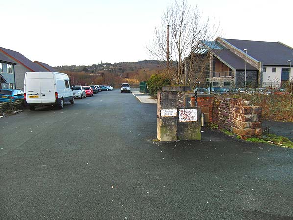 Looking west along what would have been the station access road on 31 January 2013. The health centre on the right now occupies part of the goods yard. In the right foreground are the remains of a gate post and wall which have survived demolition.