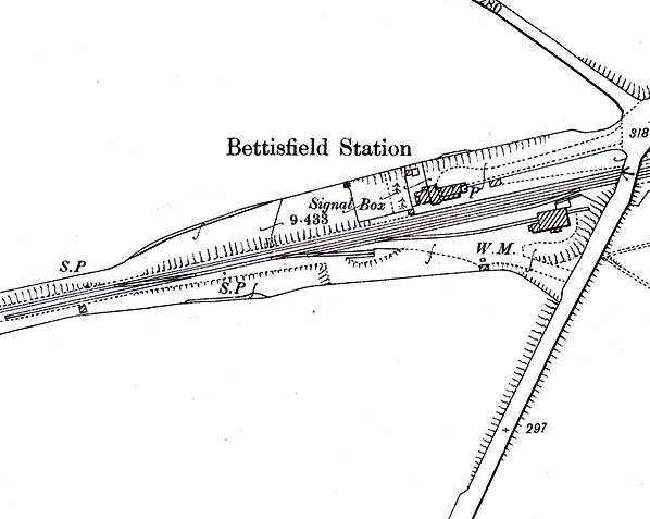 The 18 mile line between Oswestry and Whitchurch was a single track railway and although there was a passing loop Bettisfield it was for use by goods services only. Therefore Bettisfield station was provided with only one platform. It had a two storey brick built building which provided accommodation for the station master and the usual passenger facilities. The station also had its own goods facilities which included two sidings, a brick goods shed, loading bank for livestock and a 1-ton crane. A signalbox for controlling access to the passing loop and goods yard was sited at just west of the station. Bettisfield was served by local trains on the Cambrian main line running between Whitchurch and Oswestry with some services going forward to Welshpool. Many other services passed through the station from areas beyond the Cambrian network.