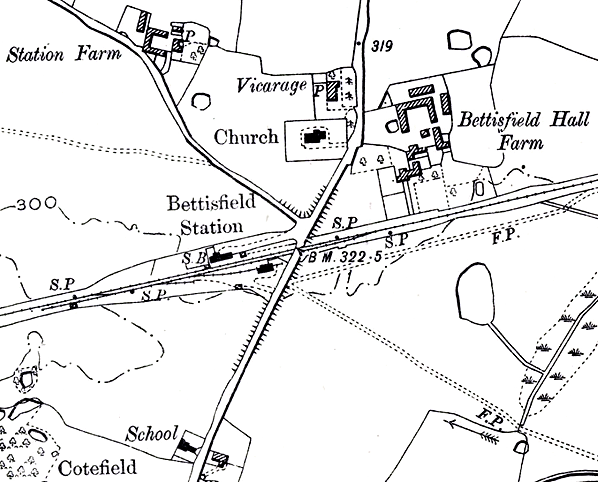 Notes: Bettisfield station was situated on what became the Cambrian Railways main line from Whitchurch to Welshpool. The section of line on which the station was located was originally promoted and built by the Oswestry, Ellesmere and Whitchurch Railway as part of a line between Oswestry and Whitchurch which was first proposed in 1860. Following ferocious arguments between competitors LNWR and GWR, Parliament authorised building the line in August 1861. One of its primary purposes for building the line was to regenerate the town of Ellesmere which had suffered from competition with other neighbouring towns already provided with railway facilities.