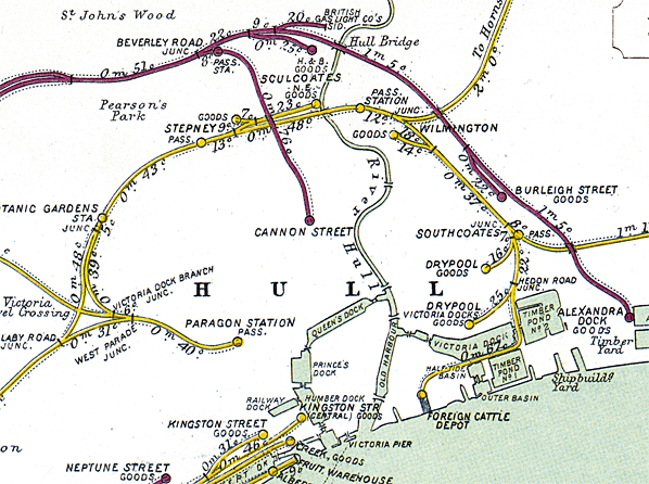 In Hull the bridge over the NER main line at Hessle Road was removed in 1962 and the elevated H&B dock branch section became connected to the Hull to Selby line at Hessle Road Junction. This was part of a scheme to reduce the number of level crossings in Hull by routing all rail traffic to east Hull via the elevated Hull & Barnsley Line.