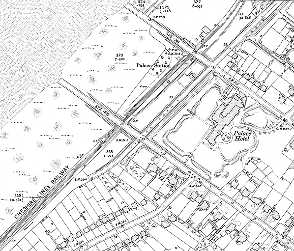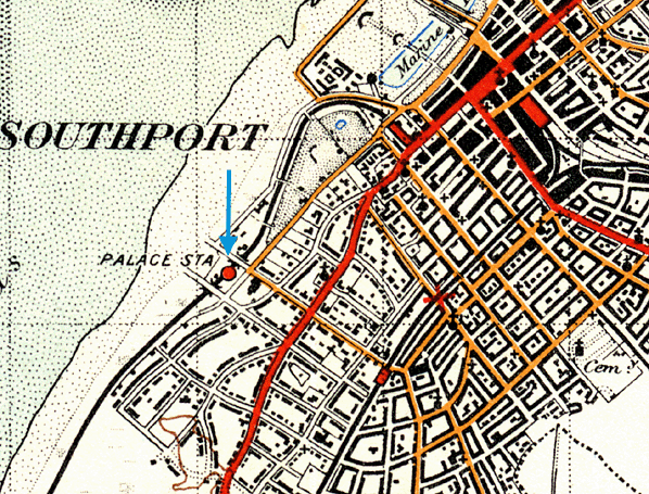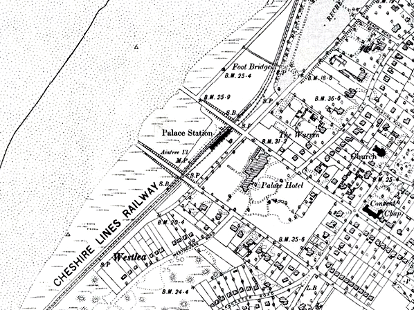 A large hotel called ‘The Palace’, which overlooked the beach, had opened on in 1866, and it was from that hotel that the station received its suffix ‘Palace’. The hotel had cost of £60,000. It was luxurious with extensive grounds, magnificent reception rooms and 75 bedrooms. Over 60 staff were employed at the establishment. In the early 1880s the hotel went bankrupt, one of its difficulties being that it was not easily accessible by road or tram. It was refurbished in 1881, the grounds were reduced in size and it became a hydropathic establishment, water being pumped directly from the sea to special baths. The SCLER station was adjacent to the hotel and made it more accessible.