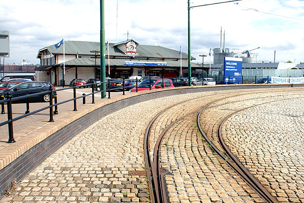 The site of the Hoylake & Birkenhead Rail and Tramway Company street tramway Woodside terminus looking east on 3 September 2013. Rails of the 1990s Birkenhead Tramway can be seen in the foreground. Photo by Paul Wright