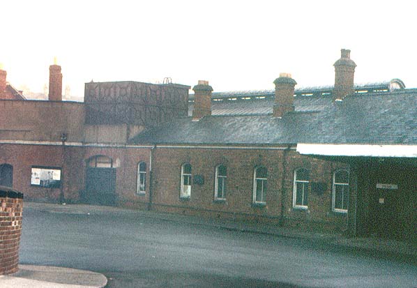 The front pedestrian entrance to Bishop Auckland Station opening on to Platform 1 with the water tank visible on the roof and the roof vents of Platform 1 behind in November 1976 Photo by David Shevels