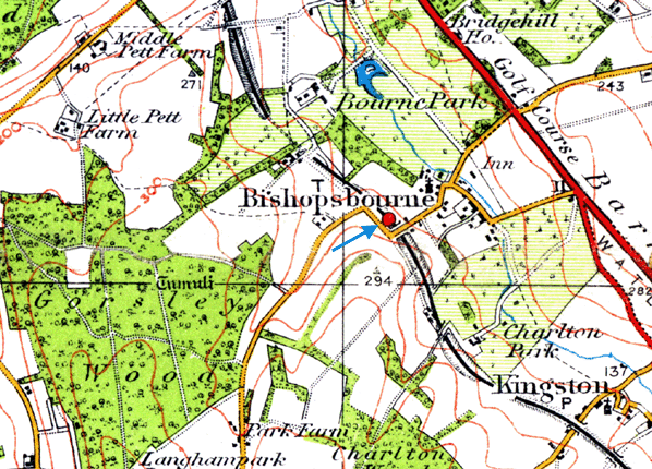 The Boche-Buster rail mounted gun was kept in the Bourne Park tunnel half-a-mile north of the station. The gun battery had its headquarters at Charlton Park but used Bishopsbourne station as offices; mess and sleeping coaches were shunted into the siding. The Prime Minister, Winston Churchill inspected the gun at Bishopsbourne on 20 June 1941.