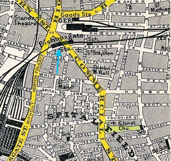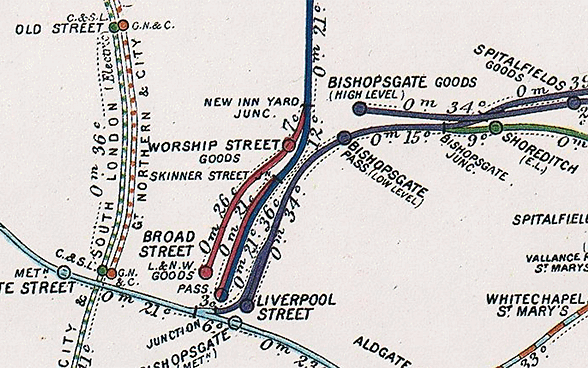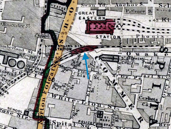 Bishopsgate Low Level Station Gallery 1 c1904 - c1949 ![]() Bishopsgate Low Level showing the line curving south-westwards beneath Commercial Street on its approach to Liverpool Street. At the time of writing this was the only known photograph of this area of the station. The platforms are, from left to right, Down Main, Up Local and Down Local. The Up Main platform was further east, beyond Wheler Street and on the south side of the line, in other words behind and to the left of the photographer in this view. The station lost its trainshed in 1902, replaced by the GER canopies as seen here. The apparent poor provision of lighting is of note. There is a row of gas lamps near the top of the wall on the left but later another row was provided lower down. This may suggest alterations to the station were incomplete at the time of the photograph but we do know the date is 1904 or shortly afterwards, thanks to some of the posters on the left. Click here for more details. Photo from JE Connor collection ![]() Stanford's map of London for 1872 shows the station as Commercial Street. This was never the intended name.