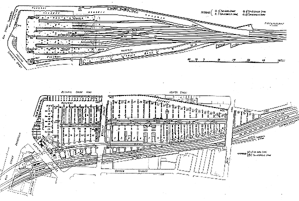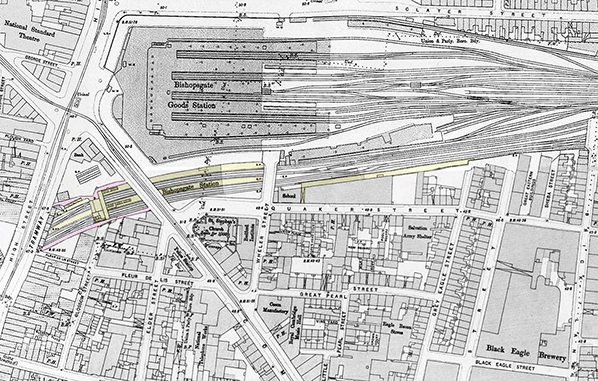 ![]() 1896 1:1056 map shows the layout of Bishopsgate Low Level station and the adjacent Bishopsgate Goods Station. Platforms and station buildings are highlighted in yellow and the access footways linking Commercial Street and Shoreditch High Street are highlighted in pink. There was access for cars and cabs with a station yard on the north side. The long building in the yard is an excursion booking office. The main station building straddles the line on a bridge to the west of Commercial Street. The building comprises the booking office, waiting room and refreshment room. From there steps go down to the local platforms to the north of the formation and the Down main line platform which forms an island with the Up local platform. The Up Main line platform is to the east of Wheler Street with entrance steps to Quaker Street at its east end. This platform had no booking office and was primarily intended for alighting passengers only. The extent of the station canopies is shown in a darker shade of yellow. There were no buildings on the Up Main line platform other than a gents' urinal. A number of waiting rooms were built into arches at the rear of the down local platform. The Suburban lines and booking office are not shown although a short section of open cutting immediately north of the booking office indicates where they run. Click here for a larger version.